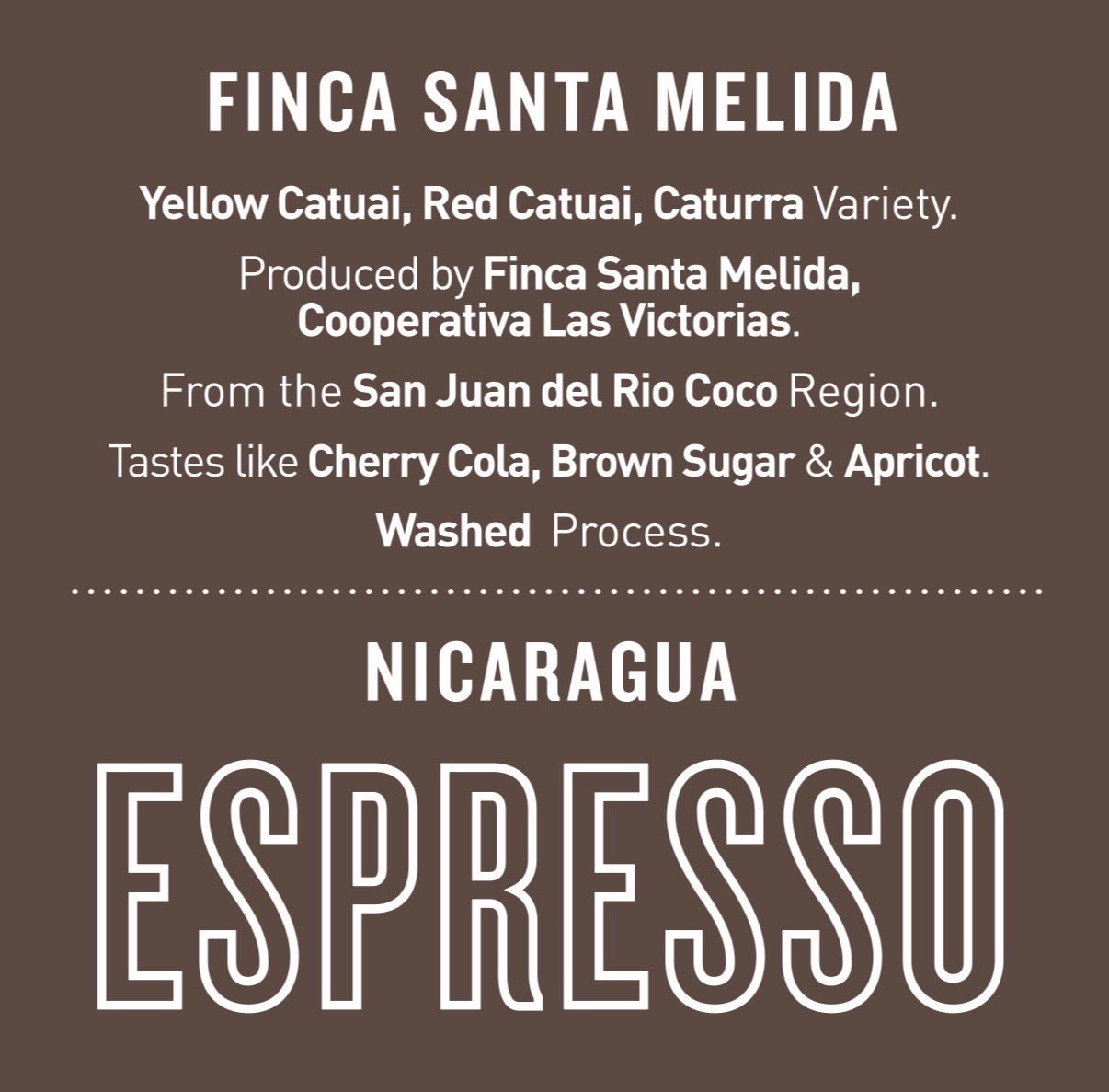 Presenting Nicaragua Finca Santa Melida — now roasted specifically for espresso. Grown by members of Cooperativa Las Victorias, this washed lot brings sweetness, structure, and fruit-forward clarity to the bar. Expect cherry-cola vibrancy up front, warm brown sugar throughout, and a subtle apricot nuance that adds a gentle lift to both straight shots and milk drinks.